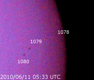 11/06/2010 05:33 UTC Immagini macchie 1079 e 1080 NOAA (alto seeing) (a, particolare di immagine trattata b, numeri macchie c) -- Sunspots image 1079 and 1080 NOAA (high seeing) (a, particular of altered image b, sunspots numbers c)