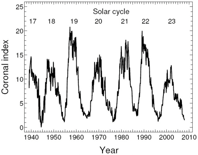 Per quanto riguarda la lunghezza della durata dei cicli solari, qui l’indice della banda verde coronale